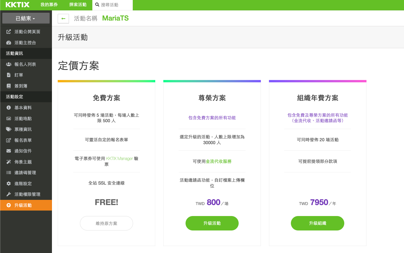 點選【活動列表 ➔選擇要升級的活動的主控台 ➔升級活動➔尊榮方案➔升級活動】將您的活動升級。