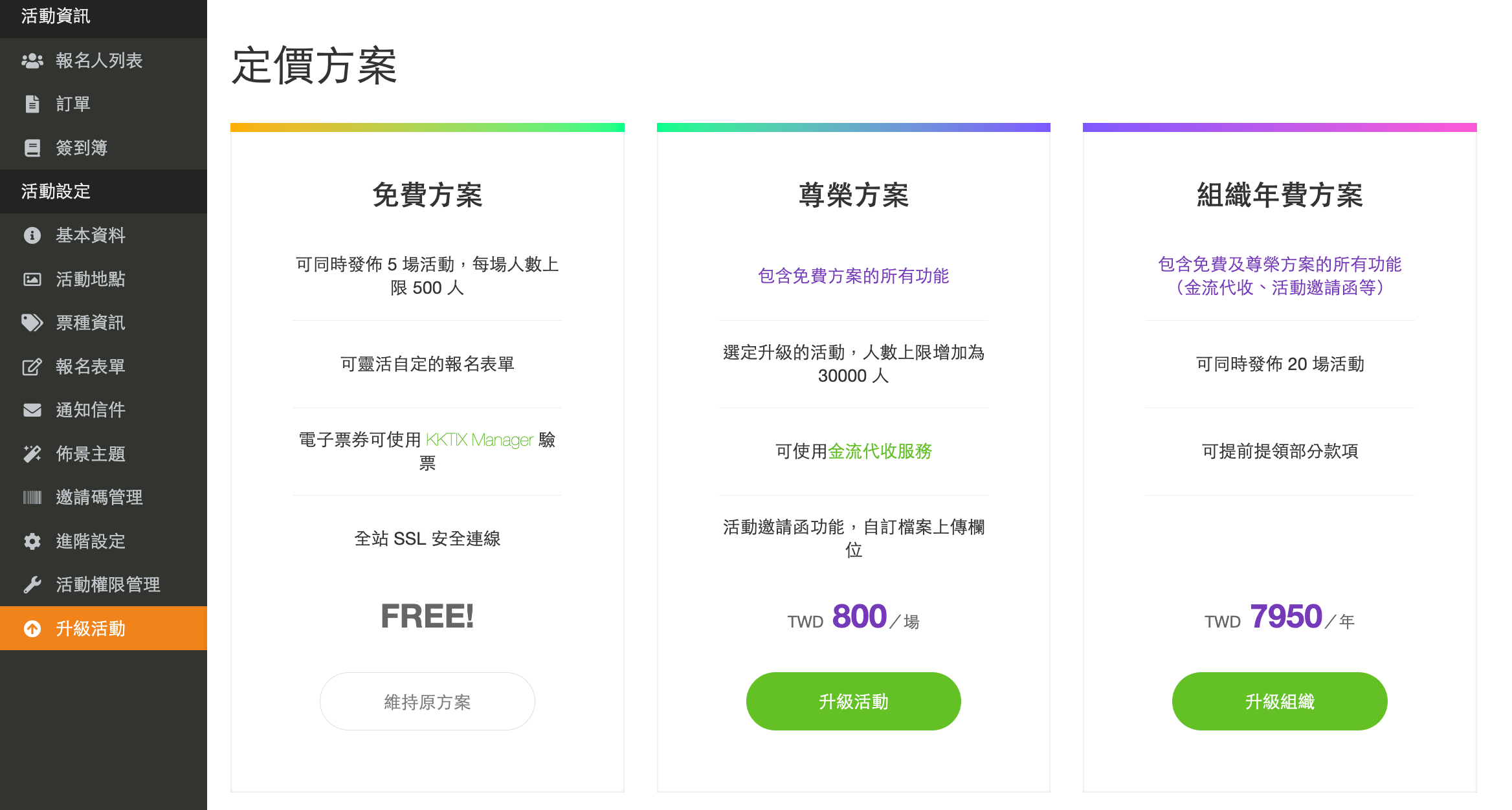 如果您需要代收、自定組織頁面外觀等服務,或者活動的預定報名人數超過 500 人,可以點選【升級活動】,選擇適合您的組織年費方案,或單次活動的尊榮方案。